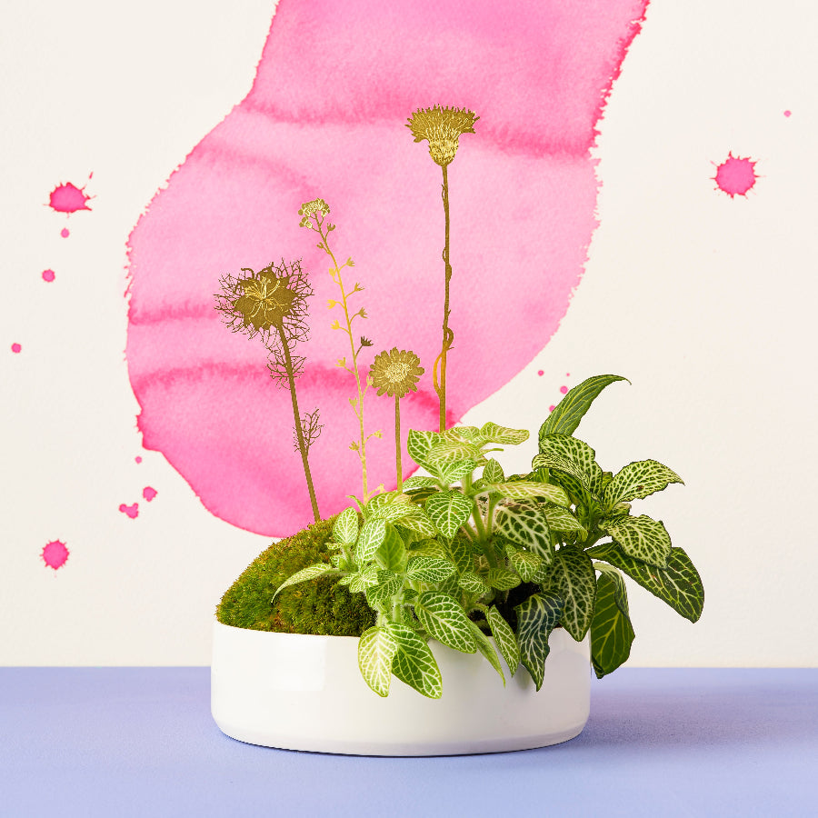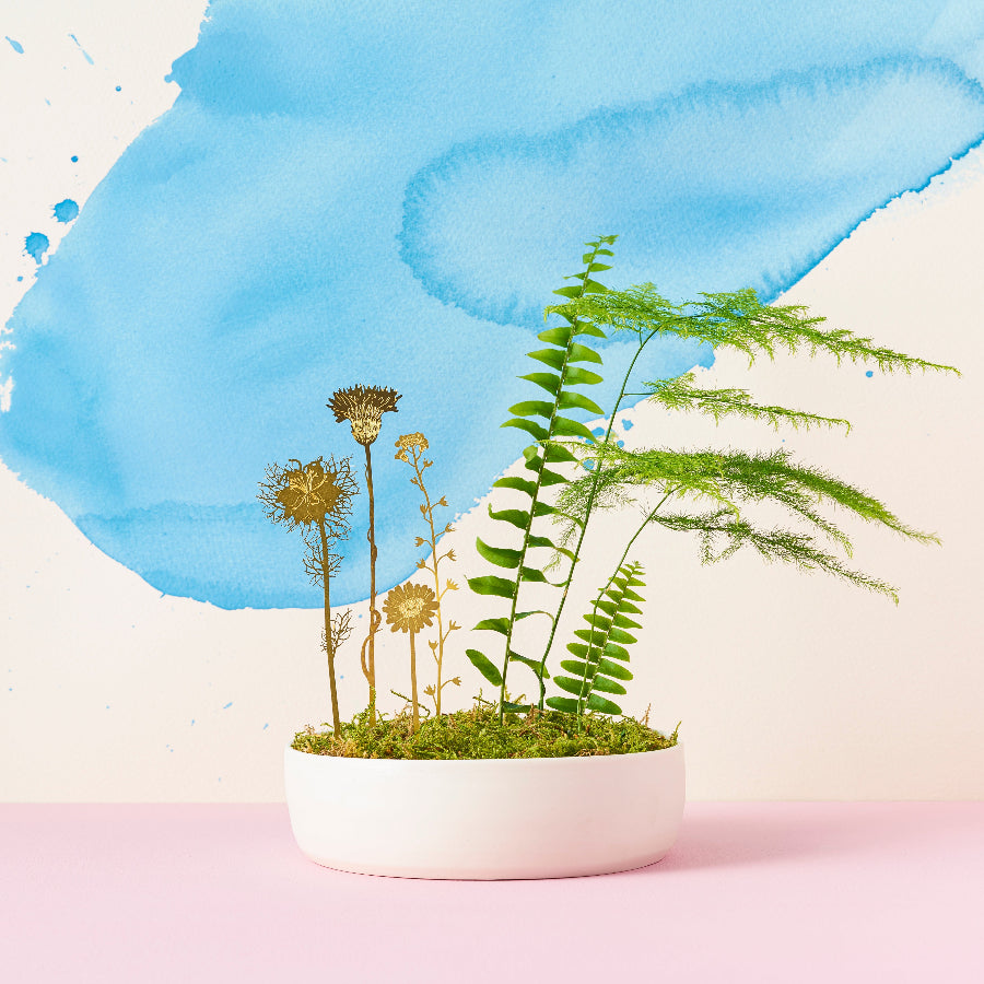 Brass Blooms are decorative ornaments for your plants. Stand them in your plant pots to create a mini indoor bee-loving garden, or place them in a terrarium. Our Garden set features a lovely little Pansy, a glorious Poppy, a delicate Lily-of-the-Valley and a bold Echinacea. If you like this Garden set, check out our other sets, Wildflower and Bouquet.
