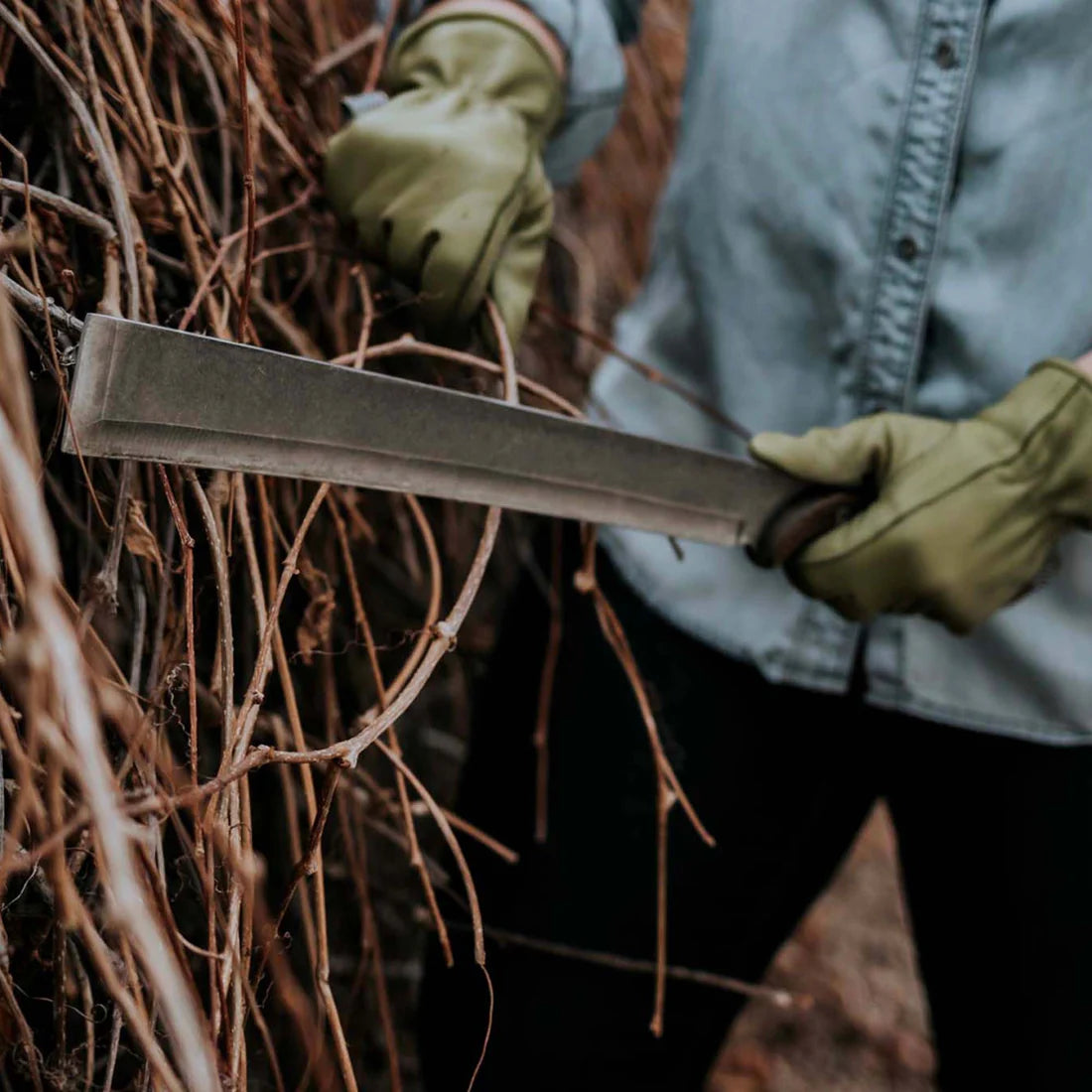 Clear brush, cut shoots and small branches, and accomplish light harvesting tasks with this thoughtfully crafted tool. Inspired by a traditional Japanese bush machete and constructed with heritage-quality materials, our Japanese Nata Tool unites versatile function and refined durability. The stainless steel, machete-like blade is paired with a solid steel core that runs the full length of the hardwood handle, providing both stability and added swinging weight. Despite its robust construction, the tool remains thin and lightweight, making it an essential addition to any collection.