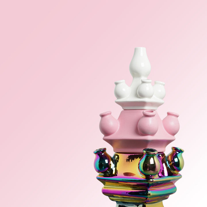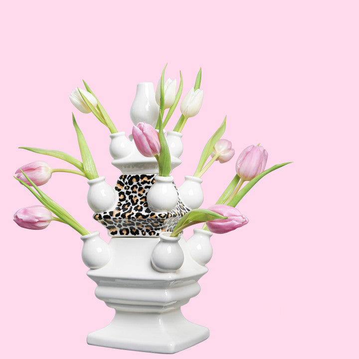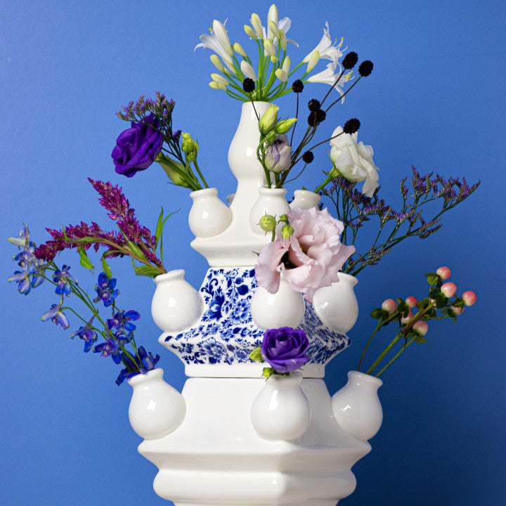 Pick them. Mix them. Stack them! Build your own tripartite vase with the loose top, middle and bottom parts from the Stapelgekte collection. Combine different colors and designs to create your very own, unique vase. A tulipiere that shows your personality, which also has many different layers! Just when you think it doesn’t get any better than this, you take your stacked vase apart and you add some new parts for a whole new look. This entirely white top part is used as the top of the tripartite tulip vase and it matches perfectly with all our other middle and bottom pieces of the Stapelgekte collection. A white element in your vase adds serenity, simplicity and elegance and makes other, more colorful pieces, stand out even more. Every piece can be filled with water, so that every flower gets what it needs to stay fresh for a longer time. Let your creativity run wild and create your own amazing vase. We would love to see a photo of your own unique creation! Only want one, that is fine too as each piece can be used on its own and look fabulous too.